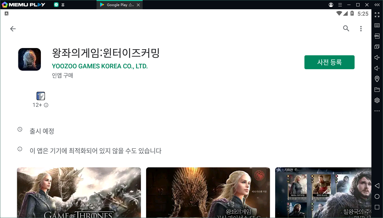 현재 미뮤 앱플레이어를 통해 왕좌의게임: 윈터이즈커밍를 사전예약 가능합니다. 미뮤 앱플레이어 7.2.1 최신버전 다운받고 구글 플레이 스토어에서 검색 참여하세요.