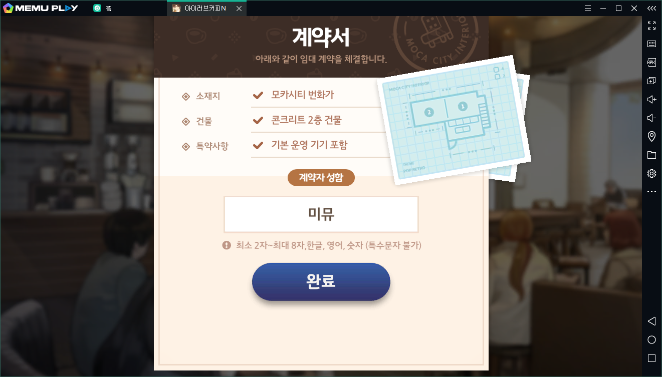 미뮤와 함께 아이러브커피N 새로운 모습을 만나고 커피숍 운영하는 매력을 느껴보자! 만약 게임 실행 시 발생할 오류문제가 있다면  미뮤 네이버 공식 카페를 통해서 해당 오류문제를 올려주시며 바로 해결하도록 하겠습니다.
