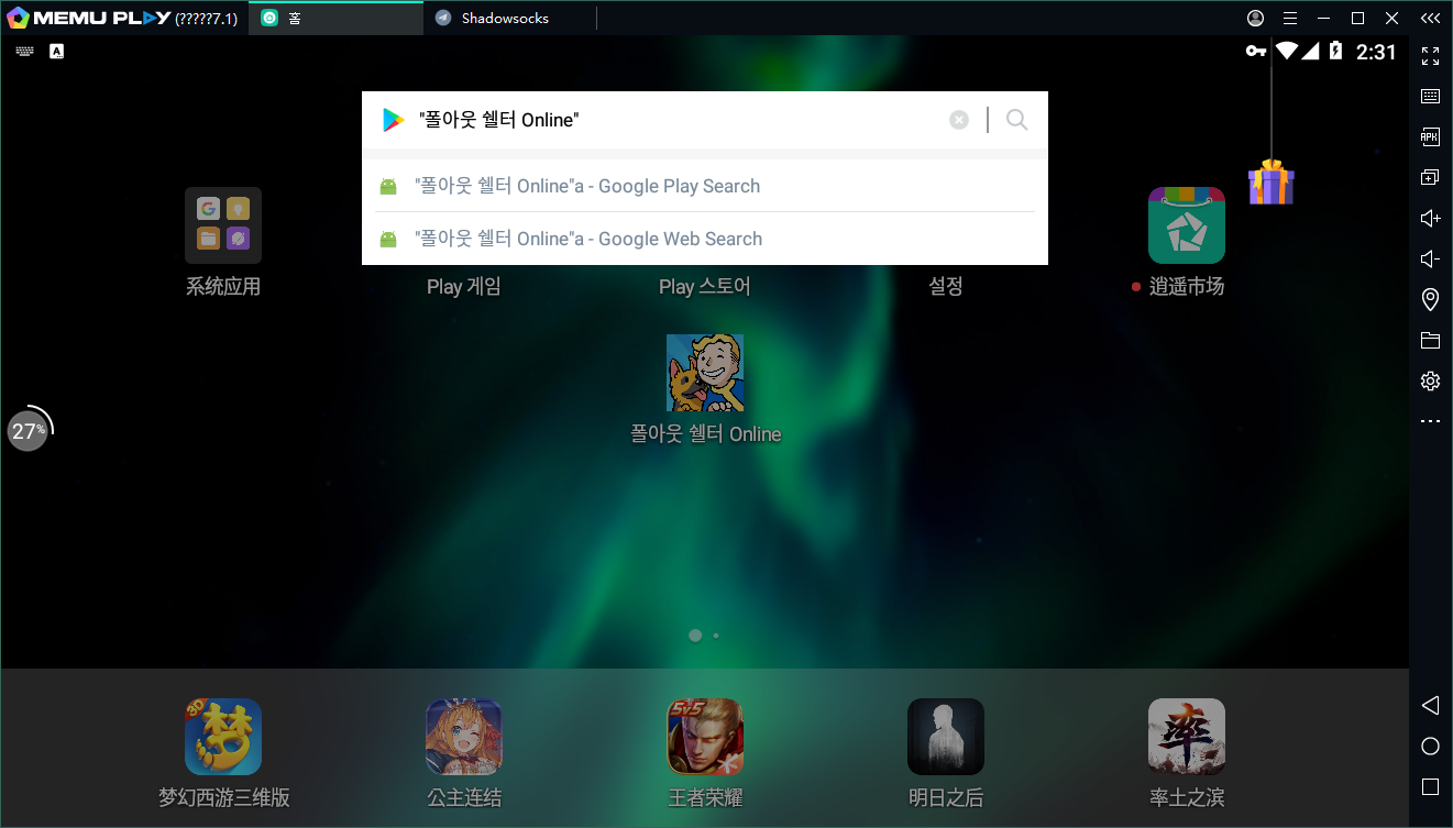 2.미뮤 앱플레이어 정식판 7.1로 이용하며 구글 플레이 스토어 혹은 바탕화면에 있는 검색창에서  “폴아웃 쉘터 Online” 검색 설치하세요.