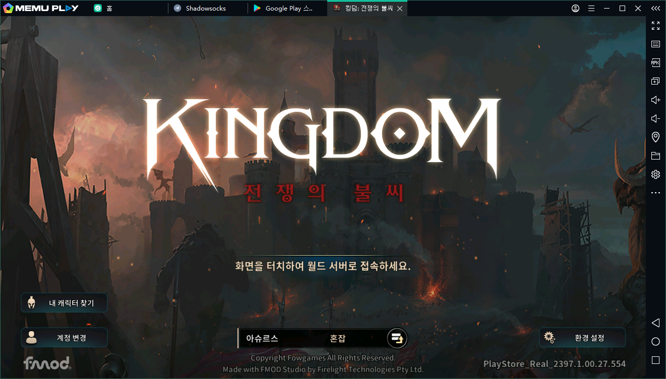 구글 계정으로 로그인 하신 후 미뮤 앱플레이어 바탕화면 검색창에 < 킹덤: 전쟁의 불씨> 검색하고 설치하기