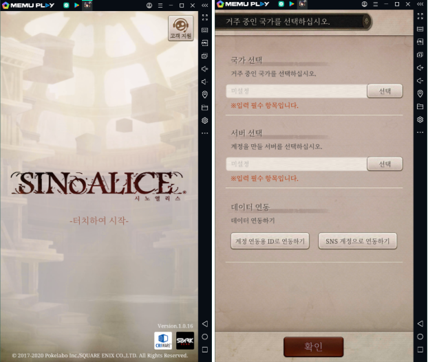 이번 출시한 시노앨리스 글로벌판으로서 플레이어님이 게임에 들어가며 자신의 거주 중인 국가와 계정을 만들 서버를 미리 선택해야합니다. 또한 서버는 미국과 아시아 2 가지를 나눴습니다.