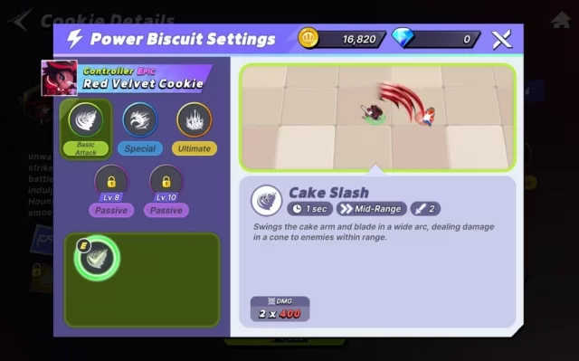 - 사령관의 케이크 군단: 점프하여 칼을 내리쳐 주변 적에게 피해를 입힙니다. 케이크 하운드를 소환하여 추적하고 공격합니다.